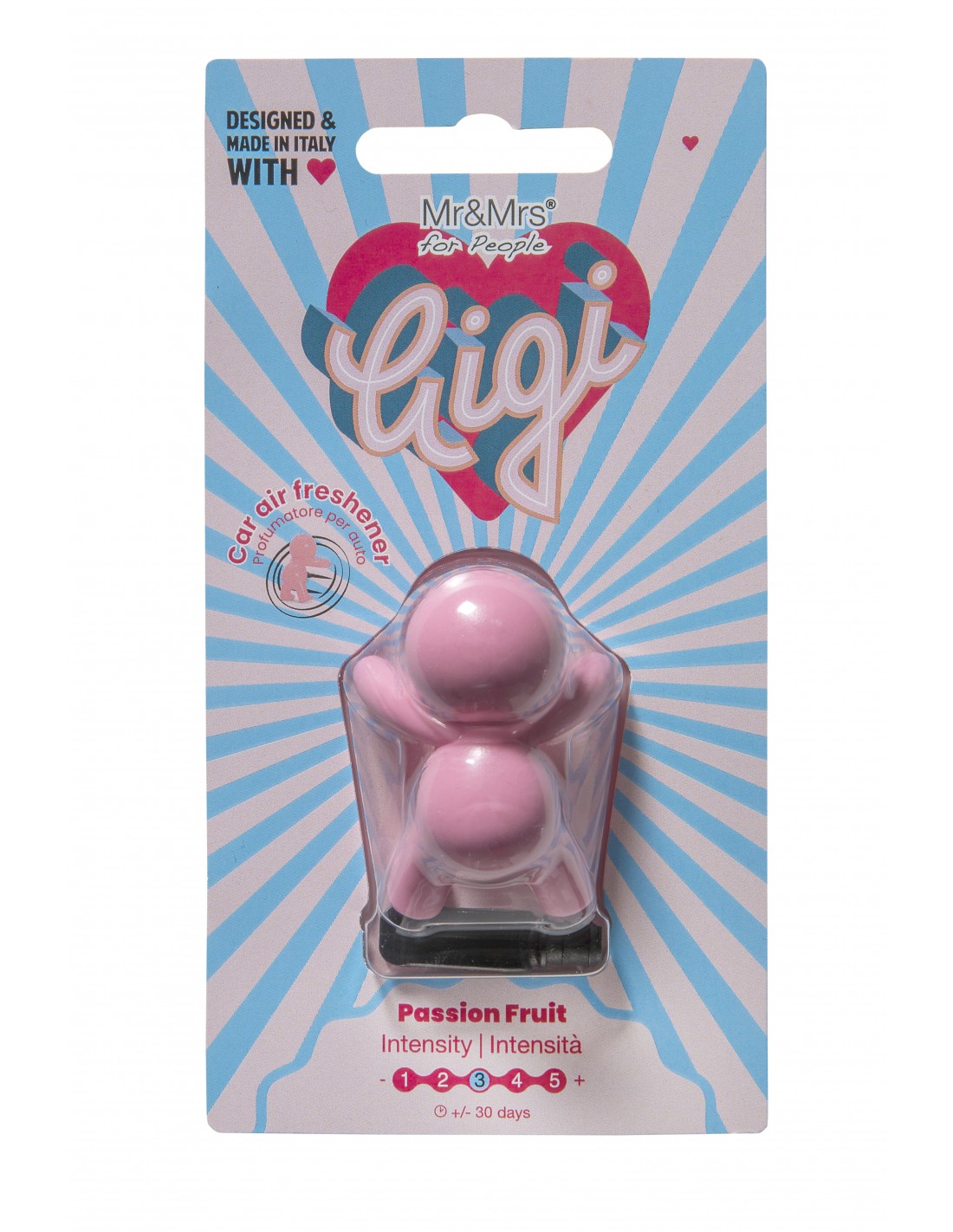 Gigi is fun and cute Supplied with a vent clip to attach to your vehicle It contains an ingredient that combats unpleasant odours Made in Italy. Design by Stefano Giovannoni